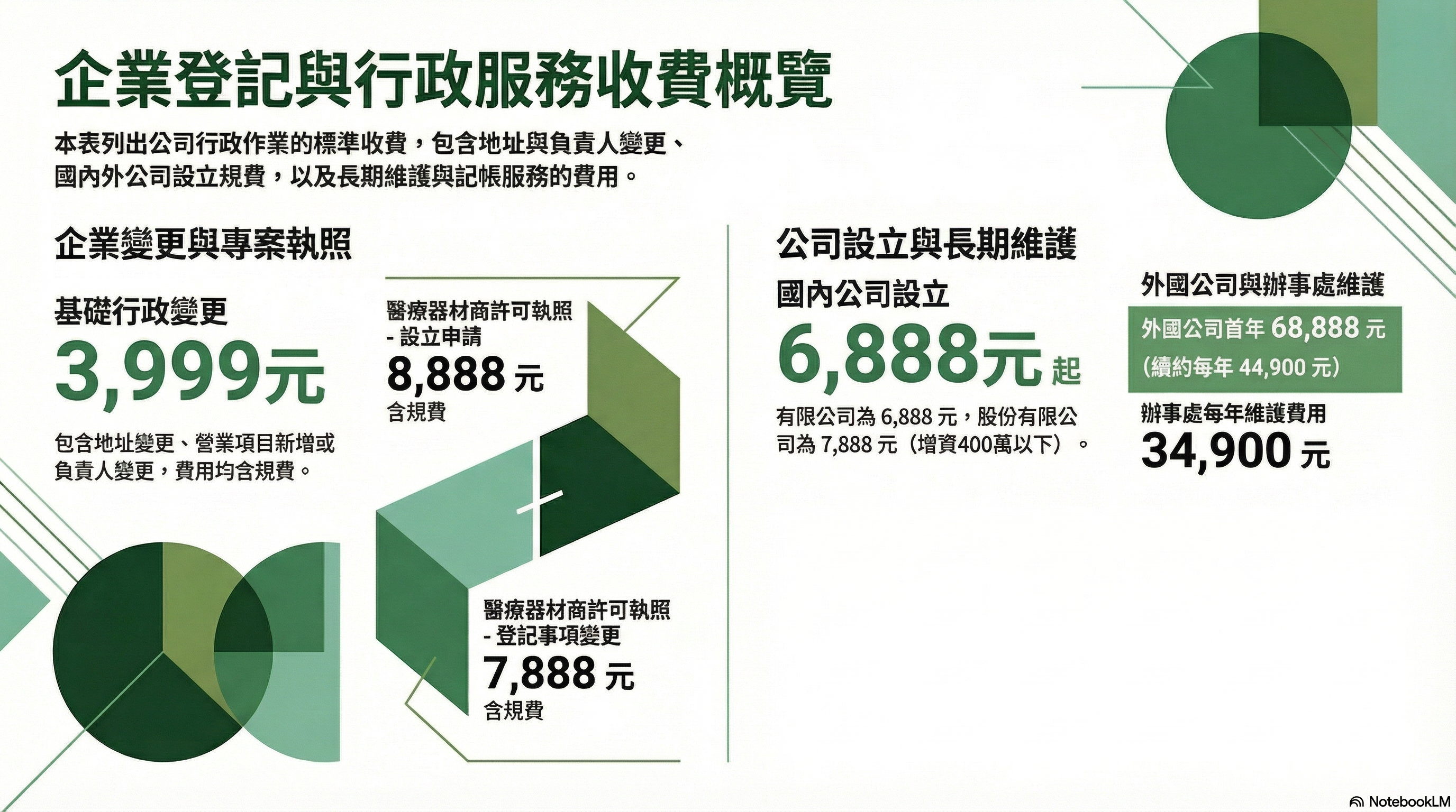 | 外國公司或分公司設立 | 68,888元 | 含400萬以下增資、第一年記帳費及營業借址費 |